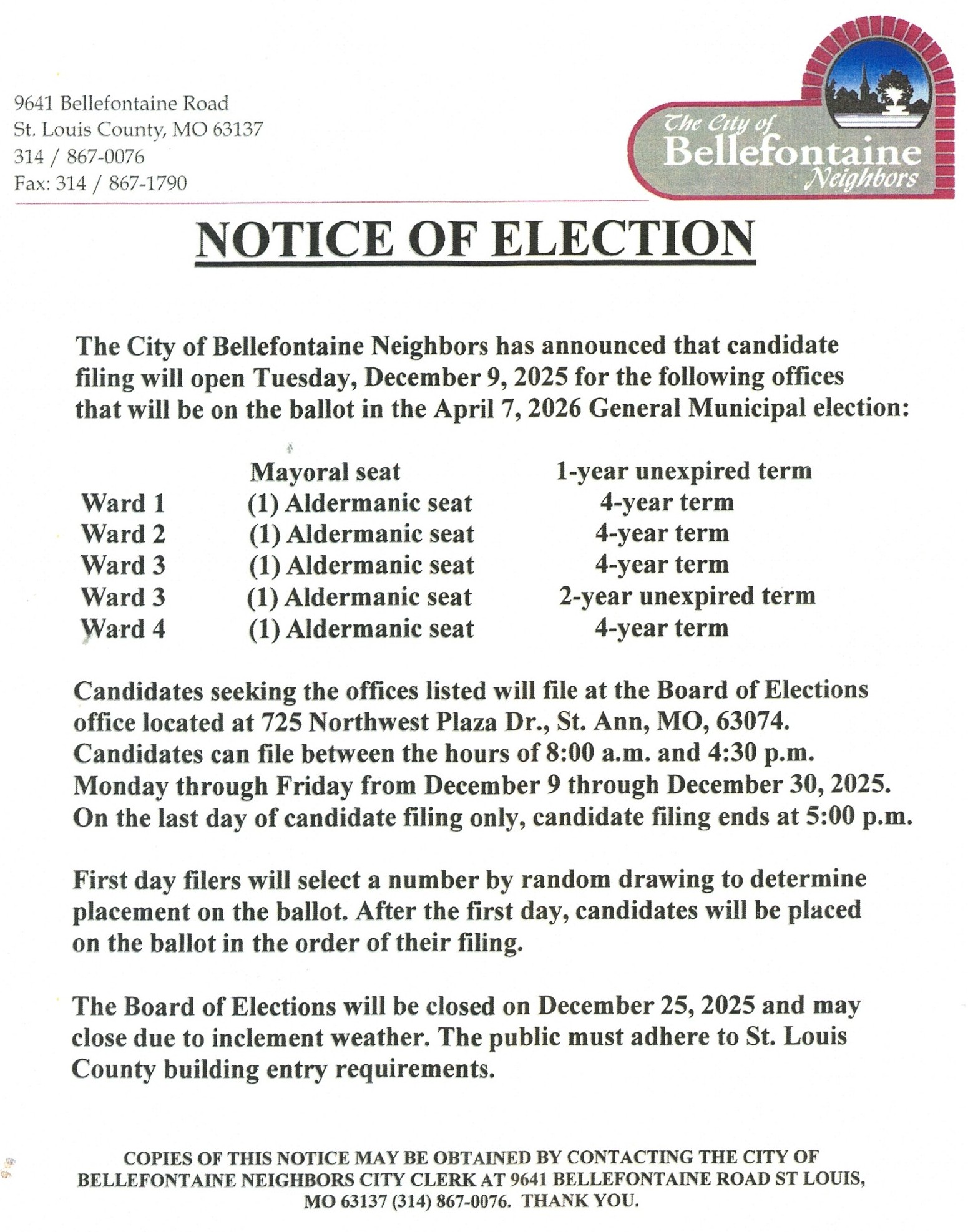 Privacy Policy | © 2012-[current year auto-inserted] City of Bellefontaine Neighbors | About This Site 9641 Bellefontaine Road · St. Louis, MO 63137 · Tel 314-867-0076 · Fax 314-867-1790